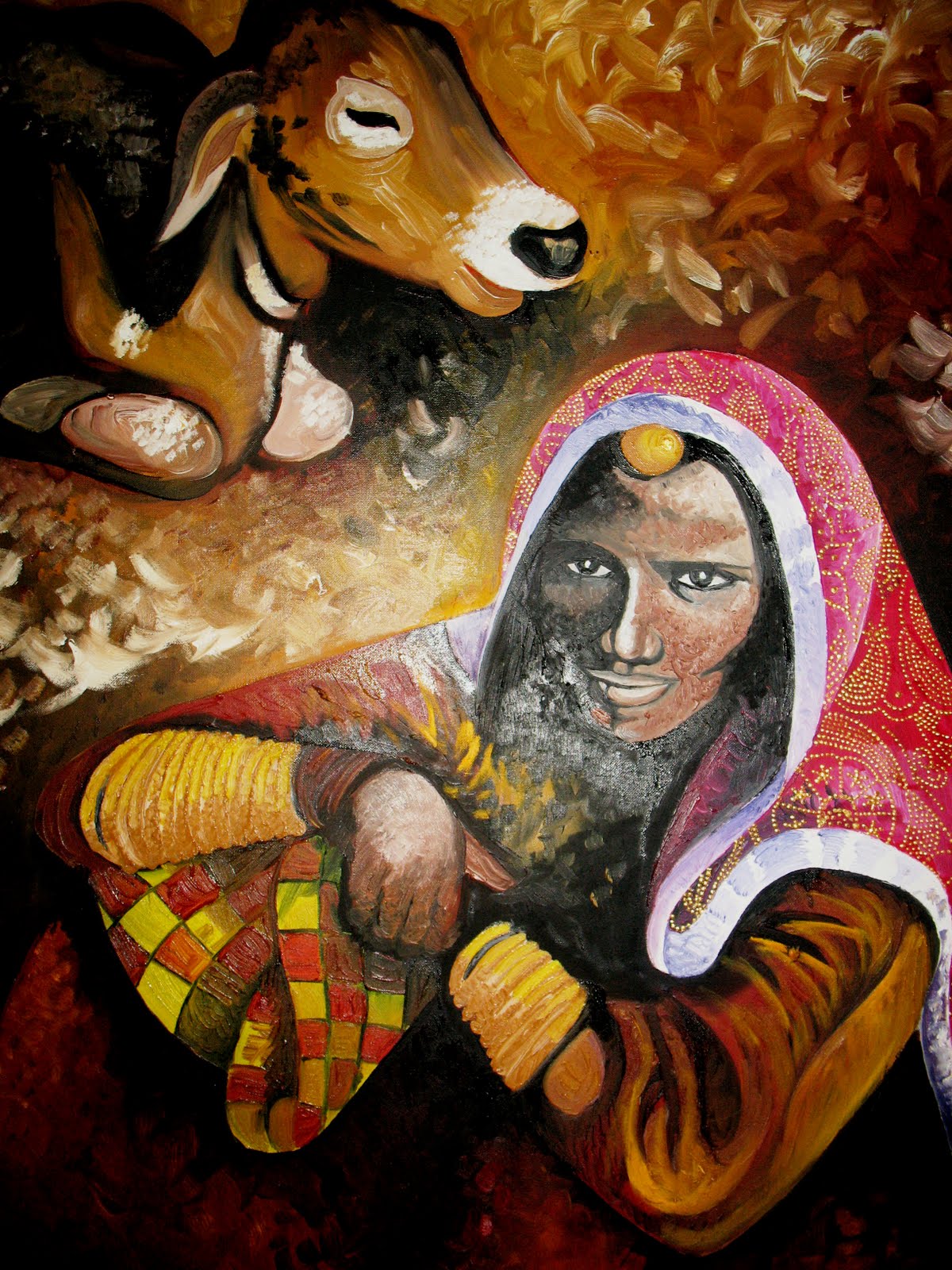 Ce tableau représente une indienne gardant une vache sacrée, il m'a permis de travailler pour la première fois les détails dorés d'un voile indien par le biais du pointillisme. J'ai utilisé une peinture dorée qui donne du relief à ce voile précieux.